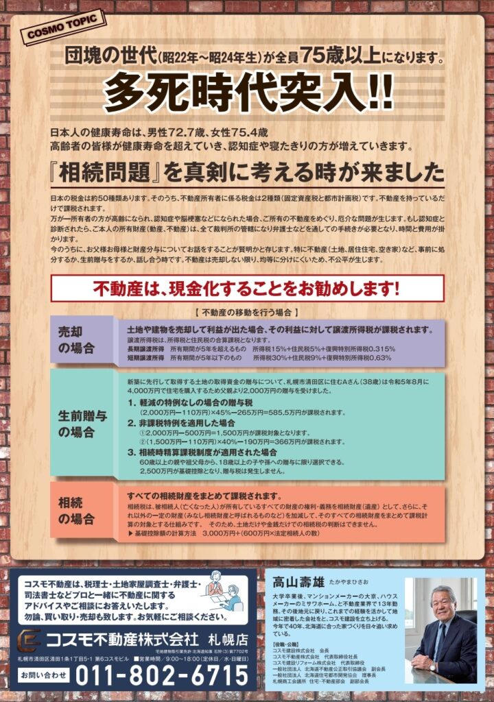 まだ元気だから、今のうちに財産分与についてしっかりご家族とお話ししておきましょう!というご提案です。不動産に関してご相談がありましたら、些細なことでもぜひコスモ不動産株式会社へ