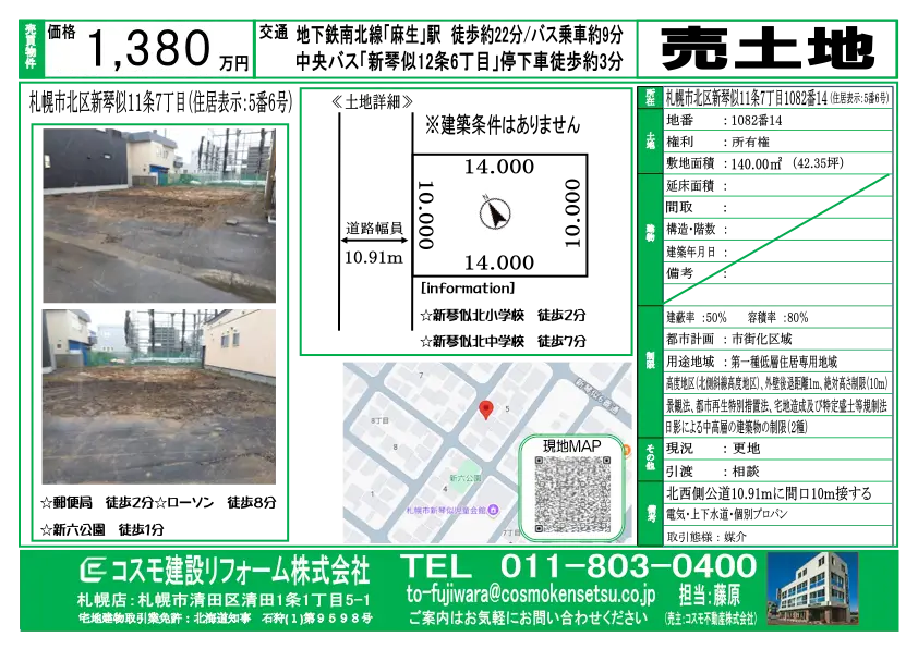 TEL 011-803-0400 (担当:藤原)営業時間 9:00〜17:30 (水曜・日曜定休)