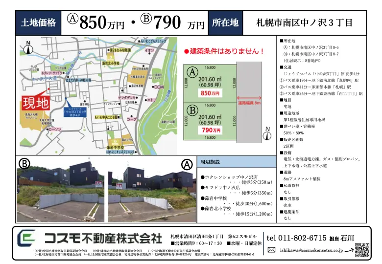 札幌市南区中ノ沢3丁目の土地です。AとBの2区画ございます。